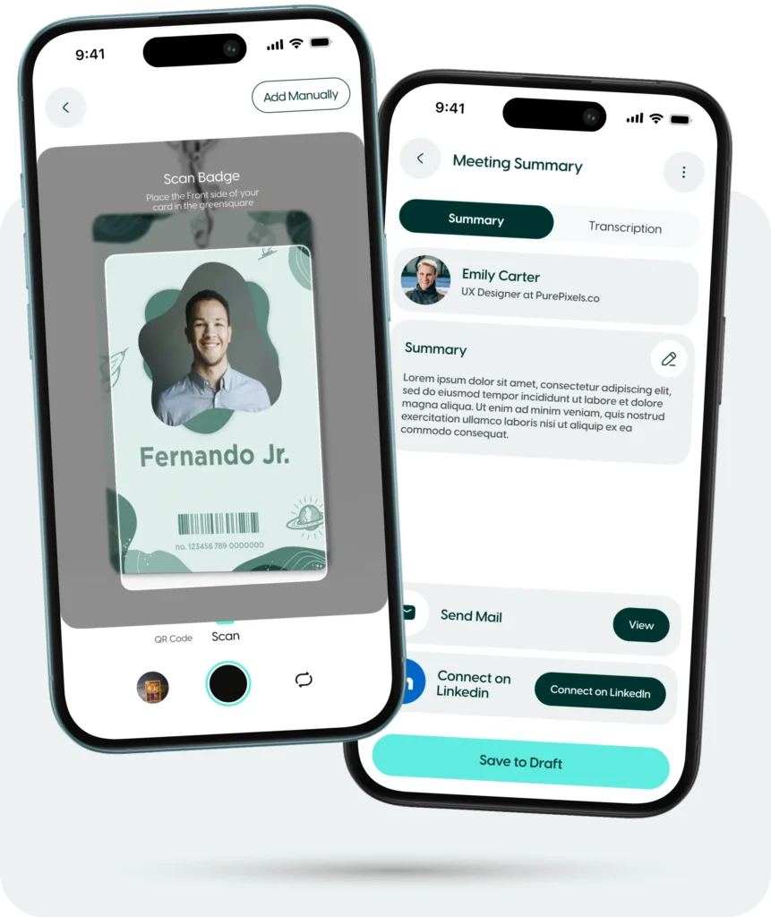 AI powered lead capture and data enrichment, automatically transcribing each meeting, summarising key takeaways, and syncing leads with CRM in real-time.